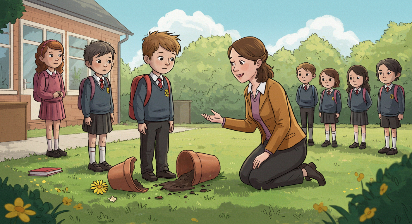 Ama tam o sırada, Zeynep Öğretmen elinde bir kitapla bahçeye çıktı. Gülümsüyordu. Ama saksıyı görünce durdu. Gözleri kırık parçaları taradı, ardından öğrencilere döndü.