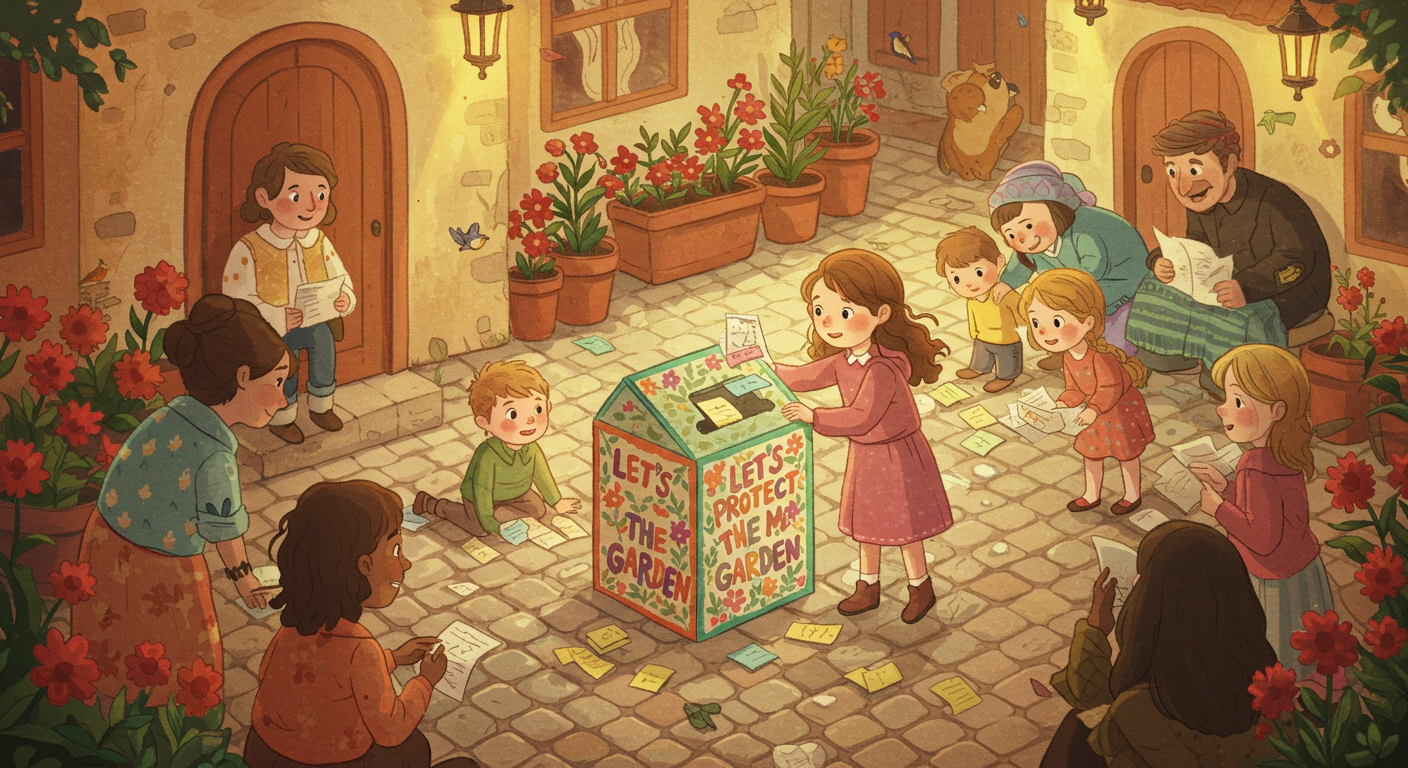 Kutuyu kasabanın meydanına bırakır. Yanına da minik kâğıtlar ve kalemler koyar. Dileyen herkes, bahçeyle ilgili duygularını ya da hayalini yazıp kutuya atar. Kimi bir şiir yazar, kimi çocukluğunda o bahçeye gizlice girdiğini anlatır. Bazıları sadece “Lütfen kalsın” der. Ama kutu her geçen gün dolar.